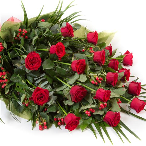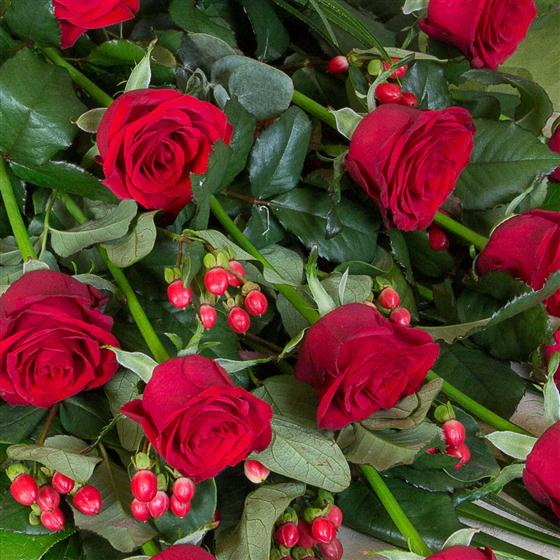A simple, classic style bouquet of red roses, hypericum berries and unusual foliage. Choose from red, white, pink or yellow roses and either 10, 12, 18, 24 (as pictured) or 24 roses.