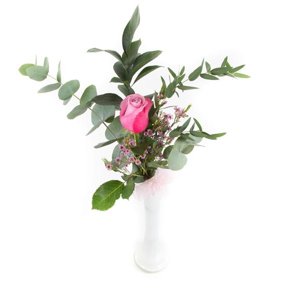 A single long stemmed pink rose presented in a vase with mixed foliage sends a simple message.
